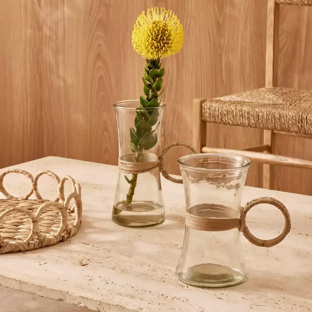 O Vaso Anel é uma peça que une leveza e autenticidade em um design encantador. Feito em vidro transparente e finalizado com um aro em rattan natural, ele combina texturas e materiais de forma equilibrada, trazendo um toque artesanal e moderno ao ambiente.